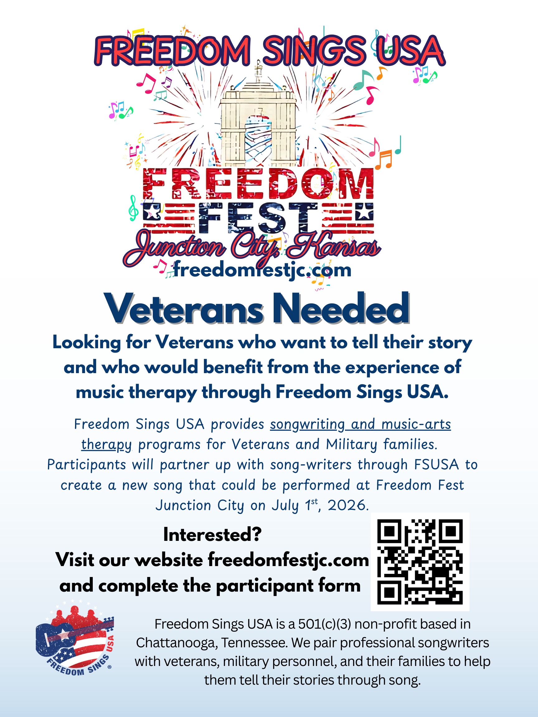 Freedom Sings USA provides songwriting and music-arts therapy programs for Veterans and Military families. We proudly work with Veterans across our great nation, partnering with award-winning and Grammy-nominated songwriters to lead workshops, classes, and events that help America’s heroes share their stories and find healing through music. Whether you’re a Veteran seeking connection, a songwriter wanting to give back, or an organization ready to support our mission, we invite you to join us—because Music is Good Medicine™.